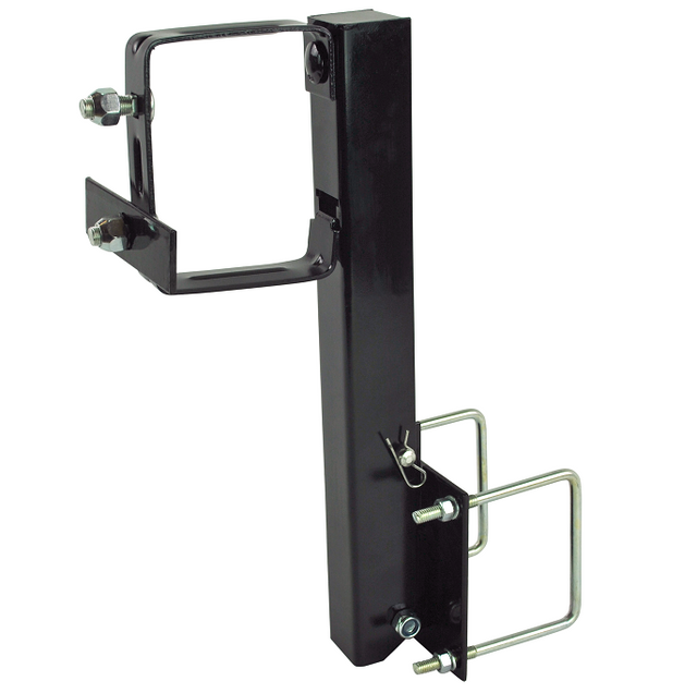 Spare Tire Carrier; Clamps To 4 Inch Wide Rear Box Style Bumper; Holds 5 6 And 8 Lug Kelsey Hayes Wheels and Fayette Type Travel Trailer Wheels; Folding; Powder Coated; Black; Steel