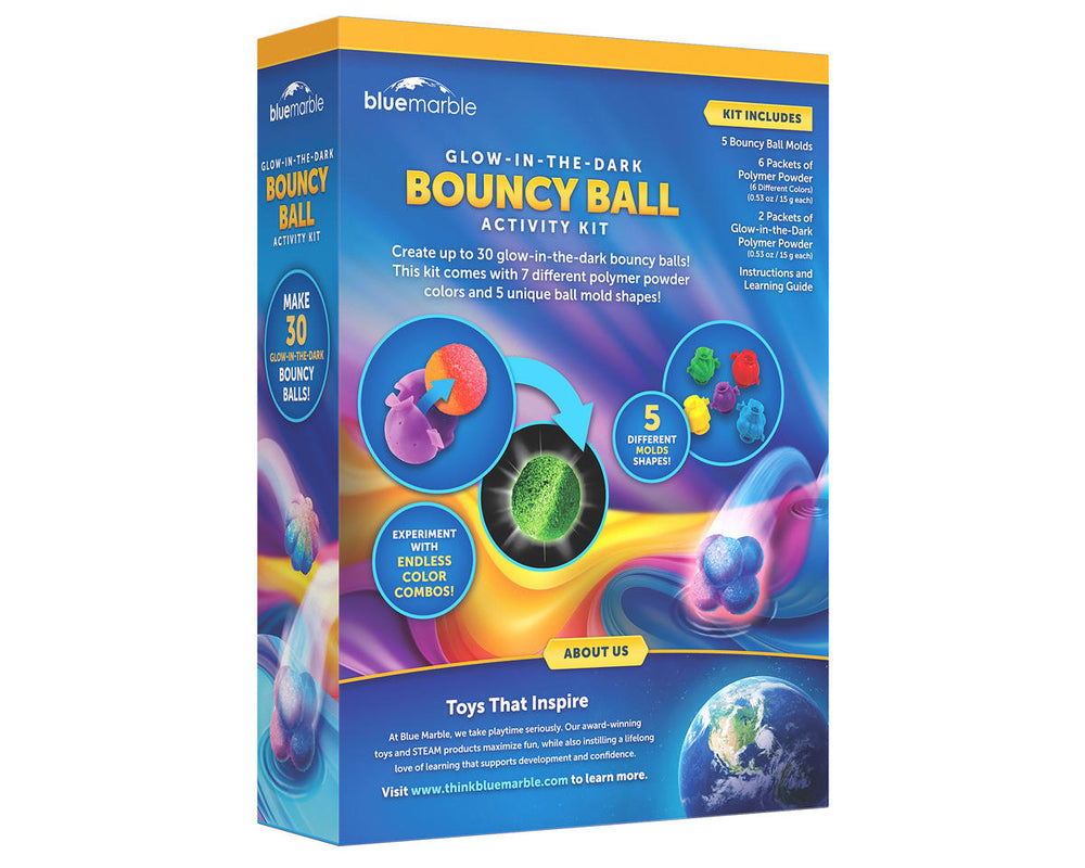 The Blue Marble Glow-in-the-Dark Bouncy Ball Activity Kit is a hands-on STEM kit that lets kids create up to thirty of their very own bouncy balls. Complete with five unique mold shapes and six different polymer powder colors, plus two additional glow-in-the-dark powders, children can experiment with endless combinations while making glowing, high-bouncing creations. Everything needed to get started is included, making this kit a fun and educational activity for curious kids.