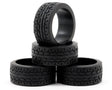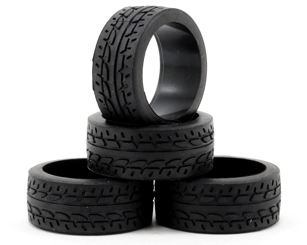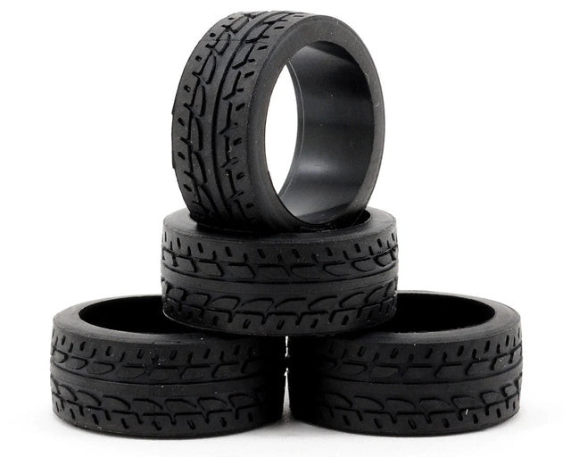 This is a set of four Kyosho 8.5mm Racing Radial Tires. These radial tires are used with the Mini-Z Racer series kits, and feature a special patterned edge that is effective on both urethane and carpet surfaces. Specific left and right sides feature a directional pattern and the durometer hardness rating is etched on the inside of the tire.