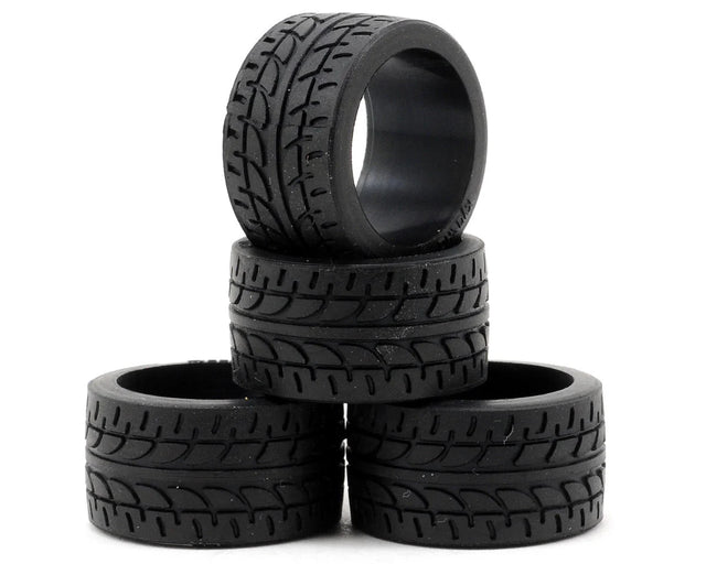 This is a set of four Kyosho 11mm Racing Radial Tires. These radial tires are used with the Mini-Z Racer series kits, and feature a special patterned edge that is effective on both urethane and carpet surfaces. Specific left and right sides feature a directional pattern and the durometer hardness rating is etched on the inside of the tire.