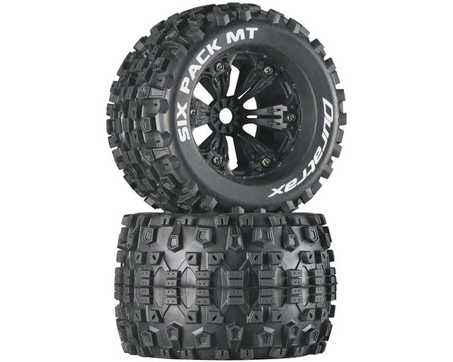 This is a pair of Duratrax 3.8" Six Pack MT Tires mounted to 6-Spoke Wheels with a 17mm Hex. Duratrax 3.8" diameter Monster Truck tires are available unmounted, or mounted on your choice of black or chrome rims. All are sold in pairs and include foam inserts.