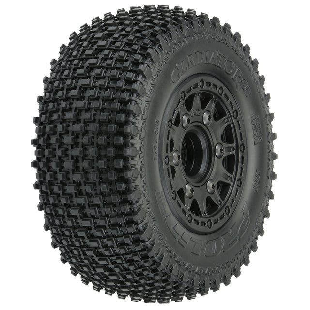 This is a pair of pre-mounted Gladiator SC Tires on Raid Black 6x30 Removable Hex Wheels. The Gladiator tread is an icon in the world of RC because of its unmatched traction and durability on a variety of surfaces. For over a decade, Gladiator tires have been tearing up bash and race spots around the World. Now, Pro-Line Racing is bringing the Gladiator tread to your Short Course Truck so you can dominate the terrain! The Gladiator tires are designed to give your short course truck optimal traction on any surface, while also giving you the durability that you are searching for.