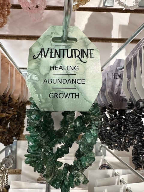 Casual bracelet made from small tumbled gemstone chips, on elastic to fit any wrist size. Each bracelet comes with a matching name and description card for its stone type.