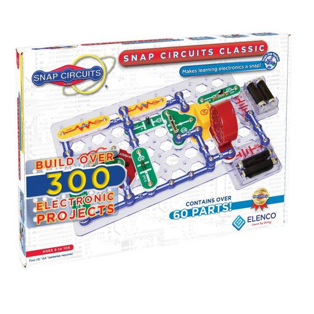 Build over 300 exciting projects with this classic kit! Snap Circuits® makes learning electronics easy and fun! Just follow the colorful pictures in our manual to build exciting projects such as AM radios, burglar alarms, doorbells, and much more! You can even play electronic games with your friends. All parts are mounted on plastic modules and snap together with ease. Enjoy hours of educational fun while learning about electronics. No tools required. Includes Projects 1-305 manuals (includes all of the SC-100 projects and 200 new ones).