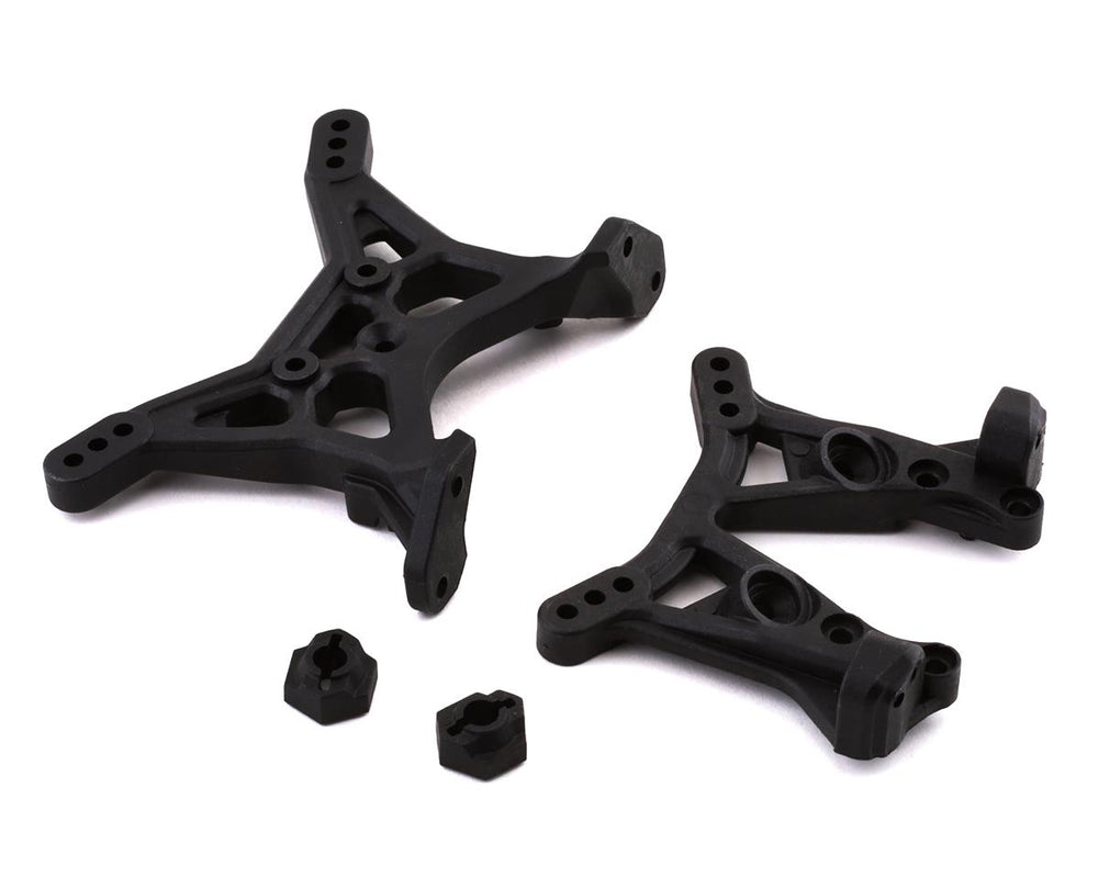 Team Associated SR10 Shock Tower Set. Package includes replacement shock towers and wheel hexes.