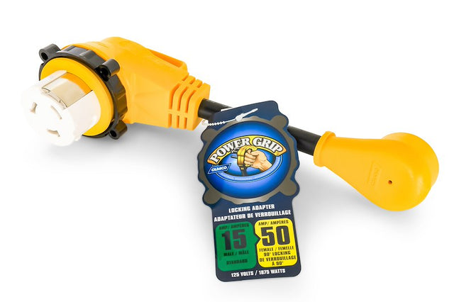 Power Cord Adapter; Power Grip ™; For Connecting RV Power Inlet To Standard Power Source; 15 Amp Male To 50 Amp Female; 90 Degree Female Locking Adapter End; 12 Inch Length; PVC Sheath And 10/3-Gauge Wire; Flame Retardant/ Heat Resistant Coating; With Plug Head Handle