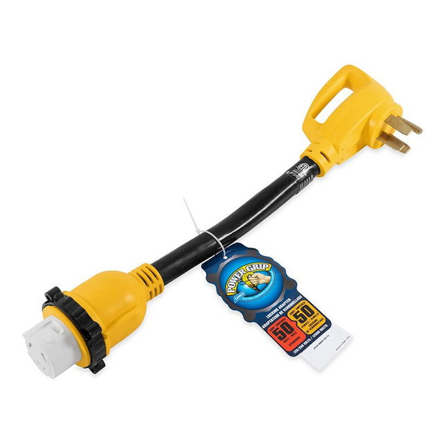 Power Cord Adapter; Power Grip ™; For Connecting Marine-Style 30 or 50 Amp RV Power Inlet To Standard Power Source; 50 Amp Male To 50 Amp Female; 50 Amp; 18 Inch Length; Locking; Waterproof; With Plug Head Handle