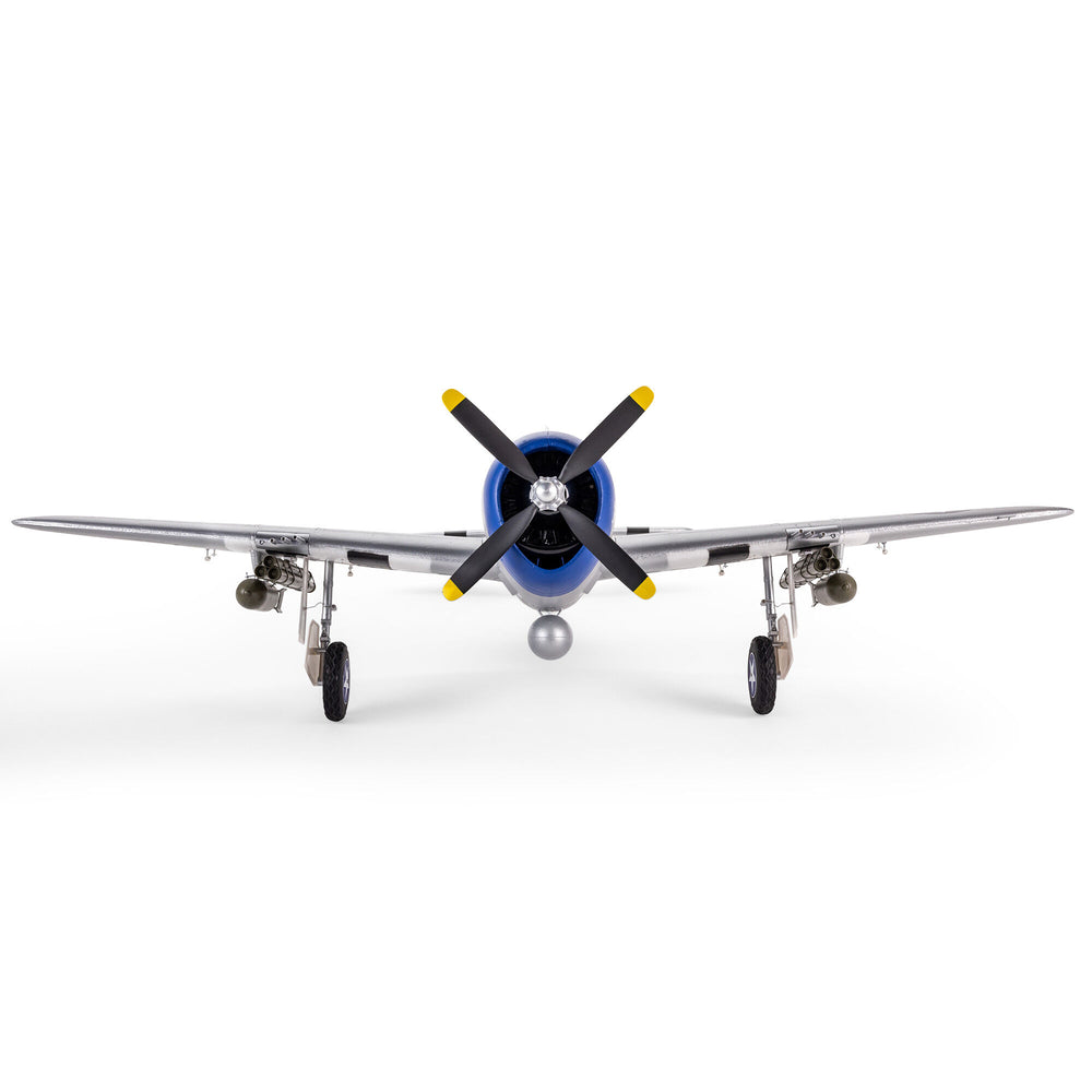When the P-47 Thunderbolt first arrived in the European theater of World War II, its rotund fuselage quickly earned it the nickname "The Jug" – but it wasn't long until that became short for "Juggernaut." Built like a flying tank, it packed the wallop of eight .50 caliber machine guns and could carry enough bombs plus rockets to wipe a ground target clean off the map. The E-flite® P-47 Razorback 1.2m is a replica of the venerable warbird that delivers an unmatched scale flying experience. Featuring functional flaps and retracts, it's the perfect first "full-house" taildragger warbird and everyday scale model for a wide variety of pilots. The 3S and 4S compatible power systems feature an upgraded 70A Spektrum Avian Smart Lite ESC, and the BNF Basic version is equipped with an AR631 receiver to deliver real-time telemetry data along with AS3X and SAFE Select technologies.