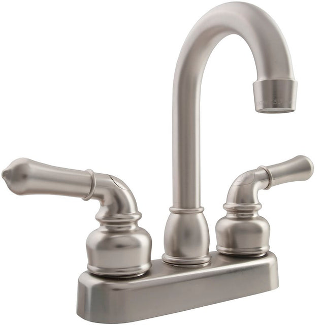 Faucet; Classical Series; Used For Bar or Lav. Single Piece 4 Inch Deck Mount; 6 Inch Hi-Arc Spout; 2 Teapot Classical Handle; Brushed Satin Nickel Plated/ Plastic Body/ Brass Spout; 2 Hole Application; Washerless Cartridge Valve