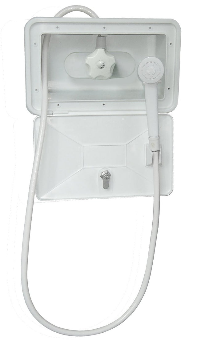 Exterior Shower; 13.7 Inch Length x 8.6 Inch Height x 4.7 Inch Depth Overall Dimensions/ 5.8 Inch Insert Height; White; With Lock; With Single Lever Shower Valve/ Shower Hose And Head
