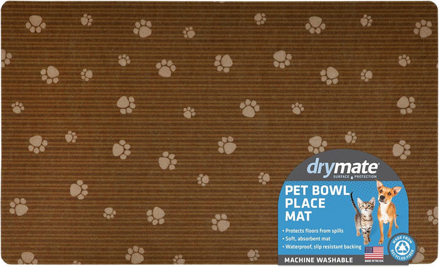 Drymate Pet Bowl Placemat, Dog & Cat Food Feeding Mat - Absorbent Fabric, Waterproof Backing, Slip-Resistant - Machine Washable/Durable (USA Made) (12” x 20”) (Brown Stripe Tan Paw)