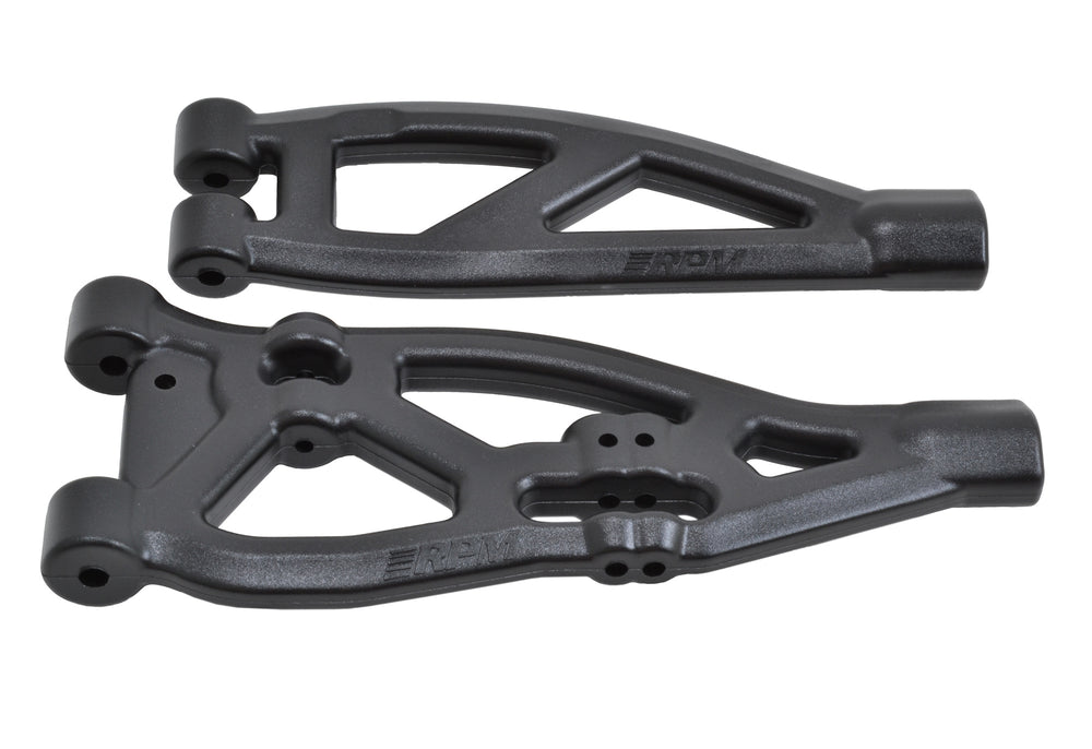 RPM A-arms for the ARRMA Kraton, Talion & Outcast as well as the Durango DEX8T are designed primarily for strength and durability, but they've added a few extra features in as well. First is slop elimination. These A-arms reduce the amount of movement of the A-arm at the inner mounts, providing for better steering response and more consistent camber, caster and toe angle settings. The next improvement is the addition of a second shock mount hole further out on the arm, providing for a lower profile suspension set-up, allowing the shocks to lay down a little further, dropping the ride height for a lower center of gravity. As an added bonus, these front A-arms are roughly 10% lighter than stock (59.5g-RPM versus 66g stock)!
