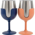 Camco 51917 Wine Tumblers, 8 oz., Navy & Peach, 1 pr.The ultra-durable tumblers made with kitchen grade 18/8 stainless steel and the double walls vacuum insulate your beverage, keeping it hot or cold longer. The tumblers have a flat bottom, so they can be used with or without the stems. Great for picnics, camping, outdoors and anywhere else traditional wine glasses might break.
